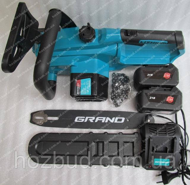 Акумуляторна пила ланцюгова GRAND АПЦ-21V Professional (4 А/год, 21 Вольт). Представлена модель є новинкою в лінійці інструменту торгової марки GRAND. Живлення пили відбувається від сучасного та практичного джерела — Li-ion акумулятора. Конструкція пили досить компактна та зручна у використанні, натяжка різального ланцюга здійснюється вручну, без використання додаткового інструменту. Автоматичне змащення ланцюга максимально оптимізує весь робочий процес. Основна перевага акумуляторного інструменту, безумовно, повна автономність застосування. Робота пилки не обмежується довжиною кабелю живлення від мережі або наявності паливної суміші. Крім цього, акумуляторна пила не викидає шкідливих газів у повітря. Такий інструмент знайде широке застосування як у домашньому арсеналі, так і на промисловому рівні.